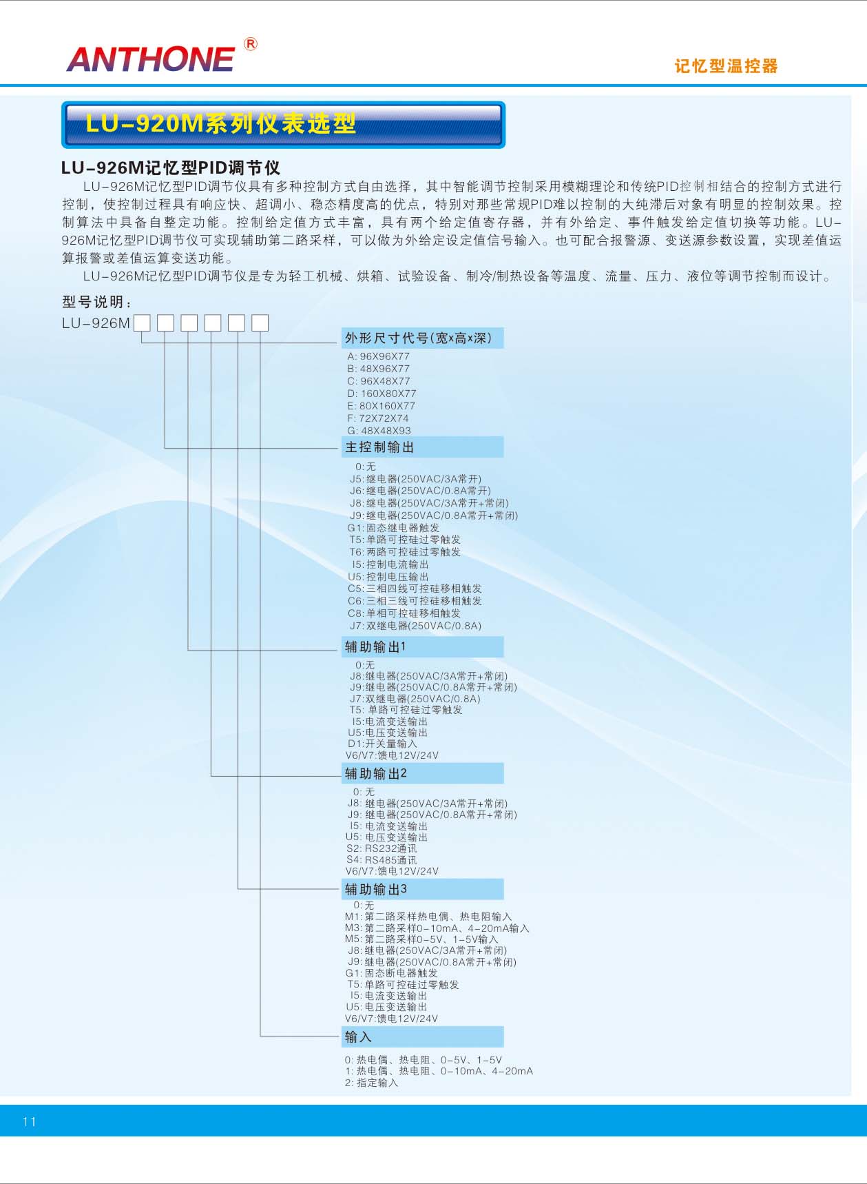 LU-926M智能調(diào)節(jié)儀是一種采用全新設(shè)計理念的高性能、高可靠性智能型工業(yè)調(diào)節(jié)儀表。專為輕工機(jī)械、烘箱、試驗設(shè)備、制冷/制熱設(shè)備等溫度、流量、壓力、液位等調(diào)節(jié)控制而設(shè)計。廣泛應(yīng)用于化工、陶瓷、冶金、石化、熱處理等行業(yè)。