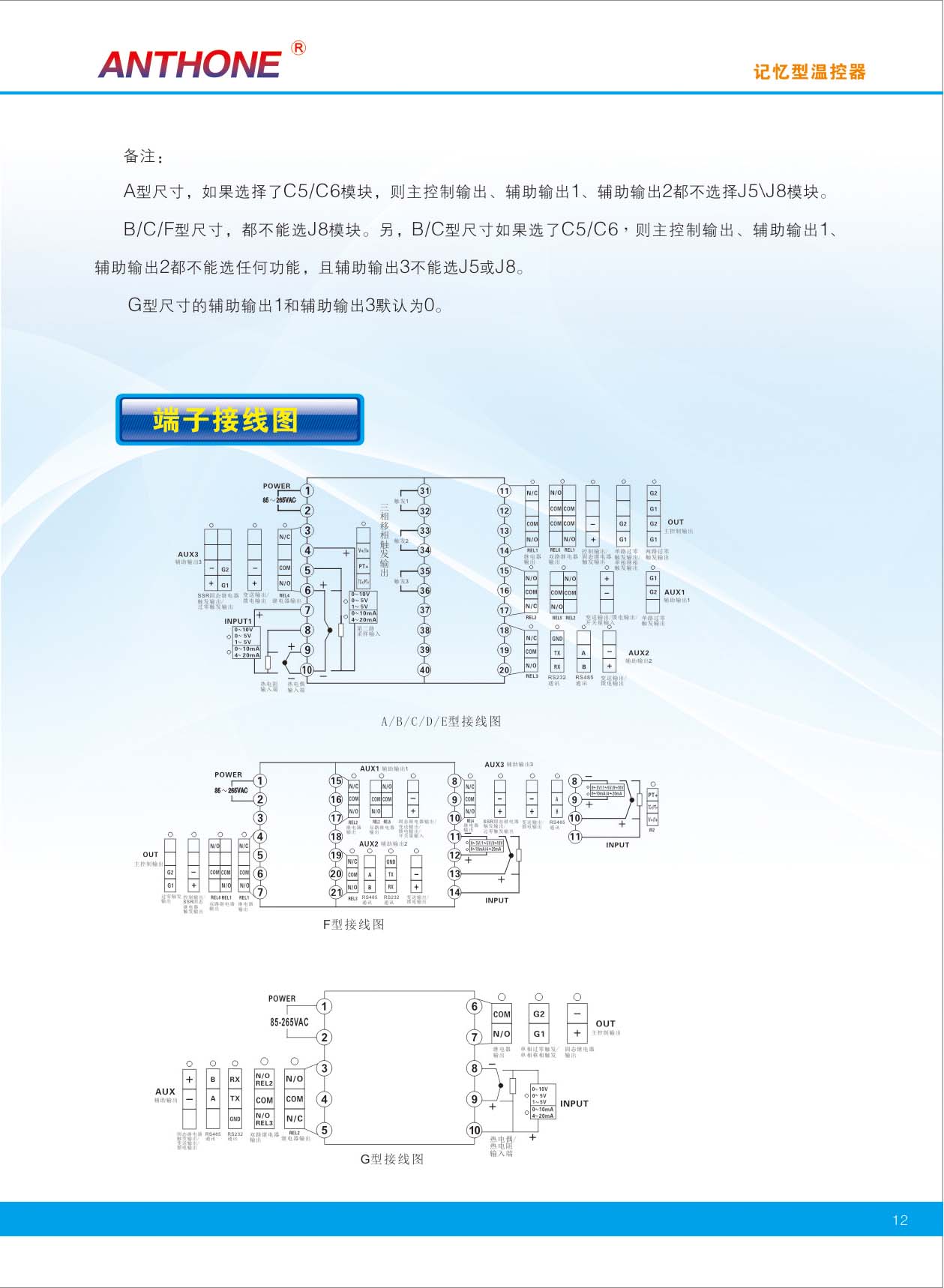 二、外型及安裝尺寸 A:外型尺寸(寬*高*深):96*96*77 B:外型尺寸(寬*高*深):48*96*77 C:外型尺寸(寬*高*深):96*48*77 F:外型尺寸(寬*高*深):72*72*74